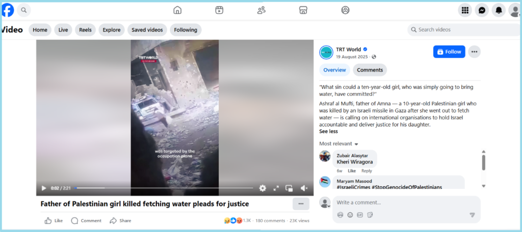 We found the viral video on the Instagram handle “middleeastmonitor” on August 18, 2025. The caption of the post read, “This is Amna Al-Mufti, an 11-year-old girl killed by an Israeli military strike while fetching water in Jabalia camp, northern Gaza. The attack occurred on December 21, 2024. According to records from the Palestinian Ministry of Health, Amna was born in 2013. Her 8-year-old brother, Baraa, was also killed in the assault.”