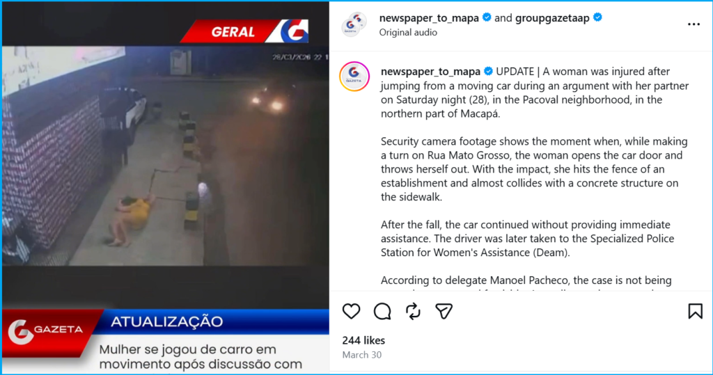 We started our investigation with a reverse image search on Google, and the results led us to a similar video uploaded on the Instagram account of a Brazilian media outlet on 30 March 2026. It was accompanied by the information that, “A woman was injured after jumping from a moving car during an argument with her partner on Saturday night (28), in the Pacoval neighborhood, in the northern part of Macapá.” Security camera footage shows the moment when, while making a turn on Rua Mato Grosso, the woman opens the car door and throws herself out. With the impact, she hits the fence of an establishment and almost collides with a concrete structure on the sidewalk.
