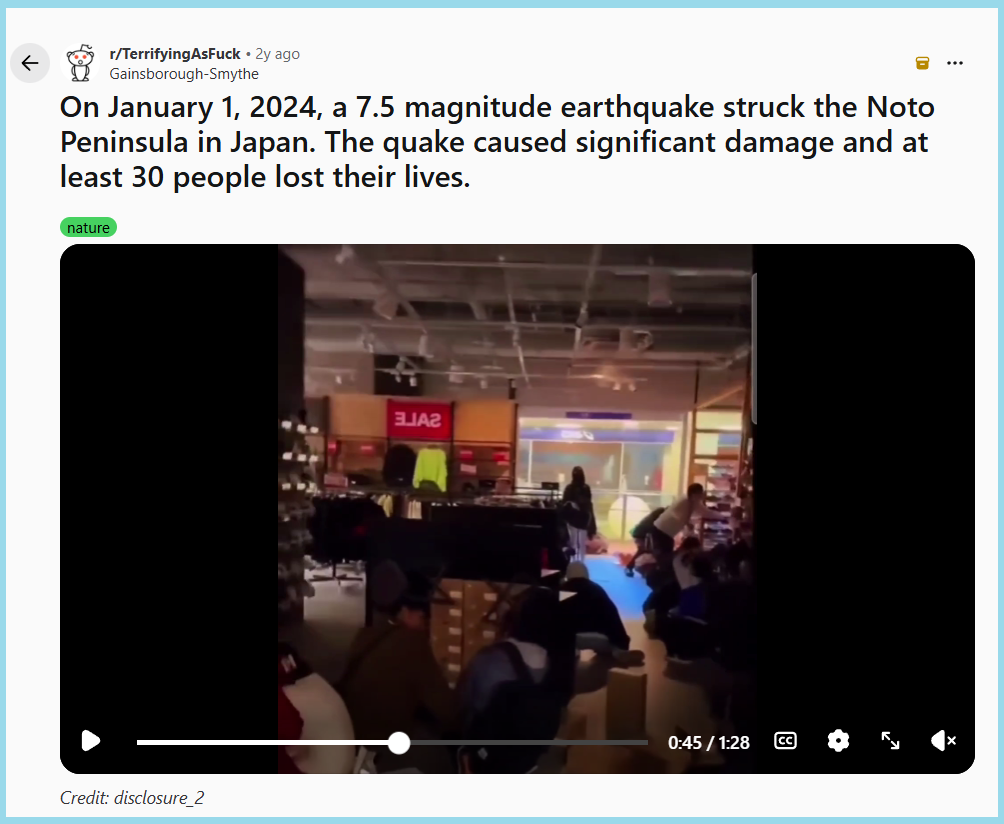 We started our investigation by taking screenshots from the viral video and conducting a reverse image search. This led us to the Reddit website where the viral clip was uploaded on May 27, 2024. The caption read, “On January 1, 2024, a 7.5 magnitude earthquake struck the Noto Peninsula in Japan. The quake caused significant damage and at least 30 people lost their lives.”