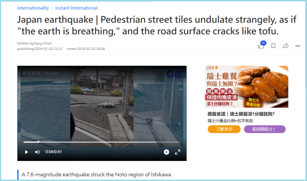 A reverse image search of the second clip on the upper part of the screen led us to a video report on the YouTube channel of The Guardian News, dated January 1, 2024, that contained the viral video. The description of the video read, “A powerful 7.6-magnitude earthquake has struck central Japan’s western coastline, prompting tsunami alerts and warnings for people to evacuate.”