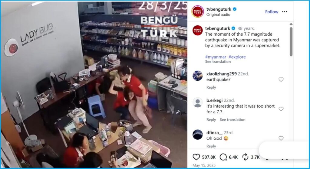 We also discovered that the same footage was uploaded on an Instagram page belonging to a Turkish national television channel. In that footage, we can clearly see that the timestamp is 28 March 2025. The description states, “The moment of the 7.7 magnitude earthquake in Myanmar was captured by a security camera in a supermarket.”