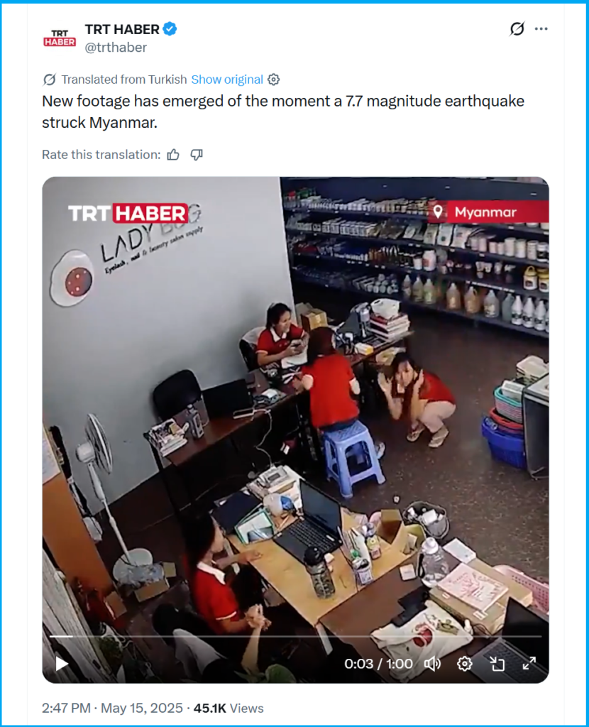 We began our investigation with a reverse image search on Google, and the results led us to a tweet by the Turkish news media outlet TRT Haber that contained a similar video of the viral clip. It was uploaded on 15 May 2025 under the caption “New footage has emerged of the moment a 7.7 magnitude earthquake struck Myanmar.” According to the caption, the video is from Myanmar.