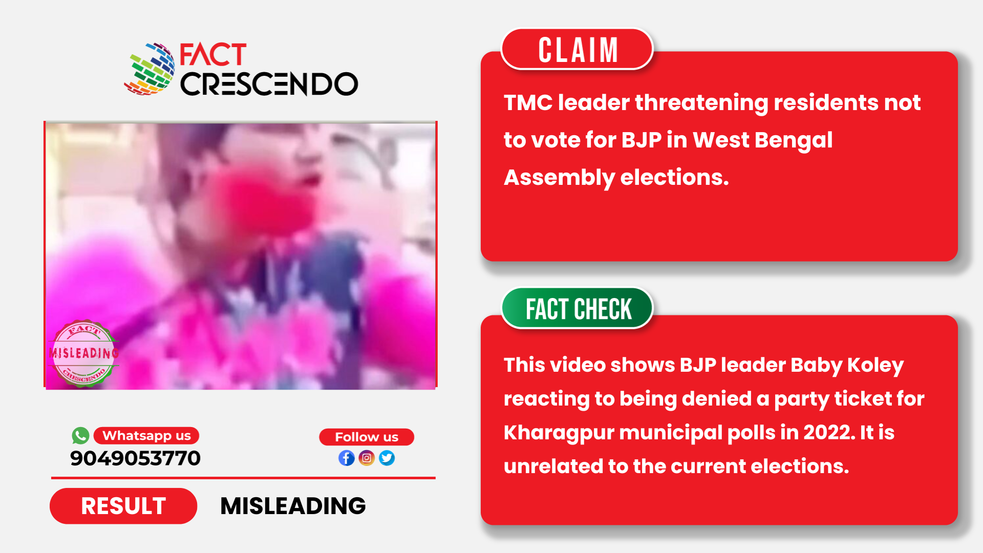Fact Crescendo found the claim made along with the viral video to be Misleading. This video is from February 2022 and shows BJP leader Baby Koley reacting to being denied a party ticket in 2022 Kharagpur municipal polls. It is unrelated to the current elections.