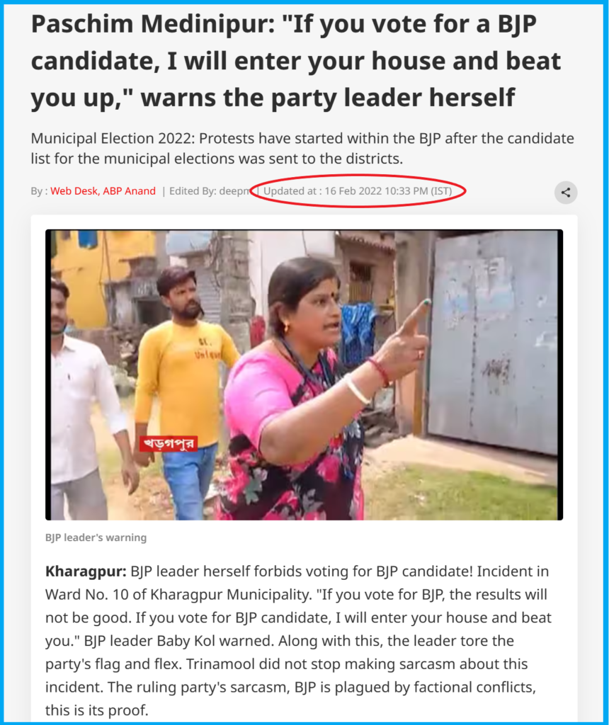 Moving forward, we came across similar reports by News 18 Bangla and ABP Ananda. The report quoted Baby Koley as saying: “I decided to contest the municipal elections. Subsequently, money was demanded from me. I was told, ‘Didi, if you wish to contest, you will have to bear some expenses.’ Later, I noticed that they were harassing me relentlessly for a week. I then asked, ‘How much do I have to pay?’ They replied, ‘You need to pay ₹5 lakh for the ticket.’ They have selected and allotted tickets only to those individuals who purchased them. We will not allow the BJP’s votes to be cast anywhere else.”