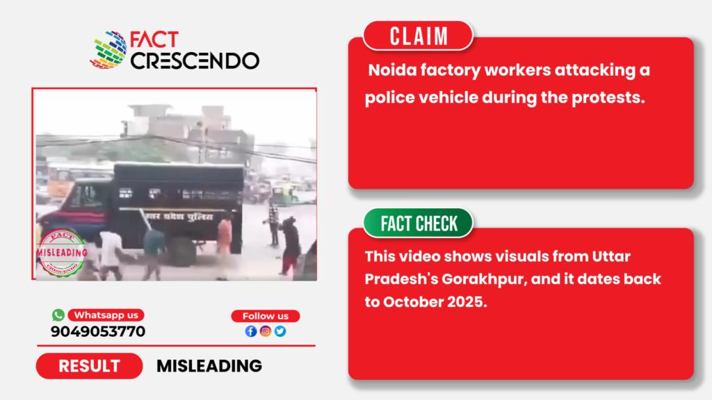 A protest by a large number of factory employees demanding an increase in wages turned violent in Noida, Uttar Pradesh, on 13 April 2026, as protestors set fire to vehicles and pelted stones over long-pending demands and alleged exploitation. Against this backdrop, a video of people pelting stones and attacking a vehicle of the Uttar Pradesh Police is going viral on social media. Users who shared the video claimed that it shows the recent scene of protests in Noida.