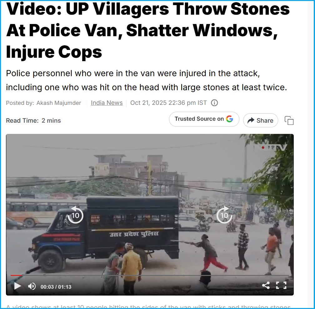 We started our investigation with a reverse image search on Google, and the results led us to a report published on the NDTV website on 21 October, 2025 with the viral video attached. According to reports, villagers attacked a police vehicle in Gorakhpur in Uttar Pradesh for not registering a case against the killers.