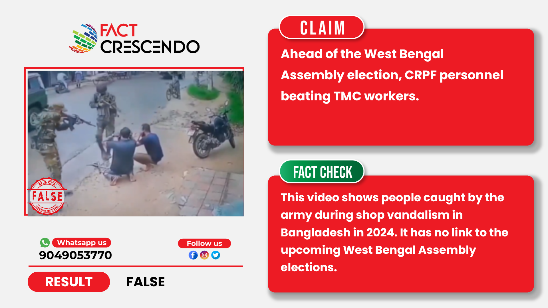 Fact Crescendo found the claim made along with the viral video to be False. This video shows people caught by the army during shop vandalism in Bangladesh in 2024. It has no link to the upcoming West Bengal Assembly elections.
