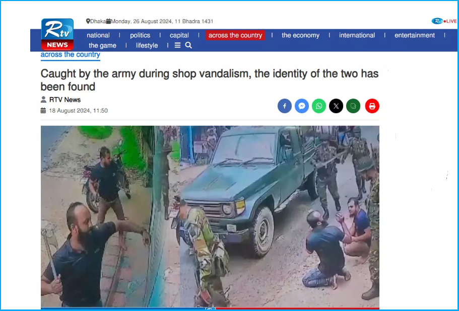 “It is reported that the incident took place when the workers of one side vandalized the shops of the other side after the clash between the two sides of BNP in Faridpur’s Boalmari. The arrested are Youth Dal workers of Boalmari Md. Tutul Hossain (28) and Dukhu Mia (30). On Thursday (15 August) they were sent to prison after showing their arrest. In this regard, the officer-in-charge (OC) of Boalmari police station Shahidul Islam said, ‘Those two people in the viral video were arrested by the army and handed over to us. Later, they were sent to jail through the court on Thursday (August 15), showing their arrest in the Sanjay Saha case.” You can read the news here and here.