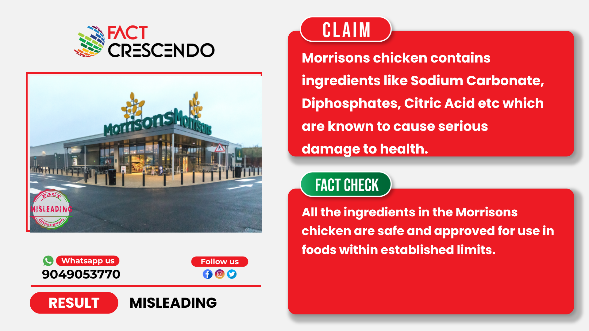 Fact Crescendo found the claim to be misleading. All the ingredients in the Morrisons chicken are safe and approved for use in foods within established limits.