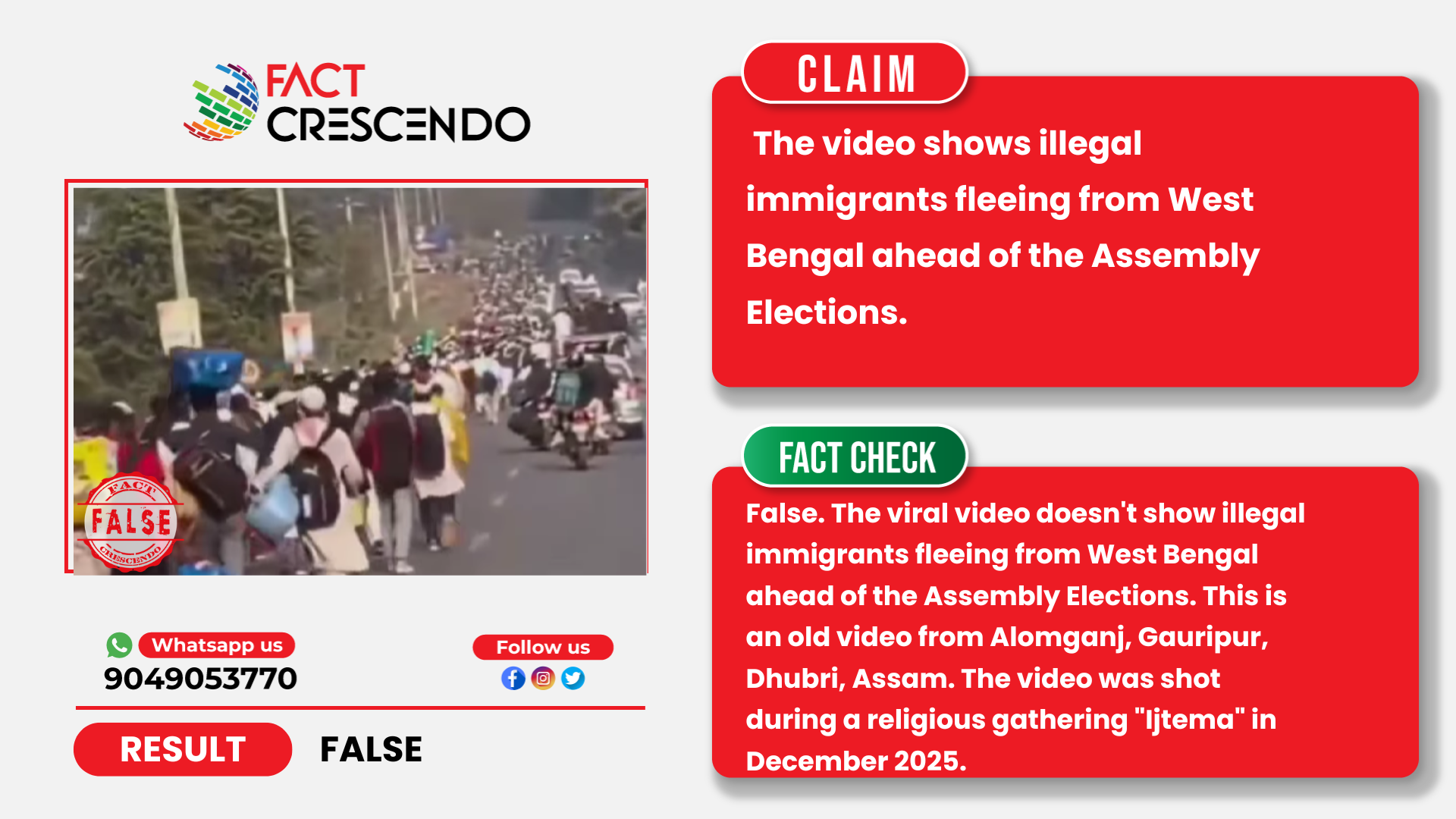 From our investigation, we can say that the claim is false. The viral video doesn’t show illegal immigrants fleeing from West Bengal ahead of the Assembly Elections. This is an old video from Alomganj, Gauripur, Dhubri, Assam. The video was shot during a religious gathering “Ijtema” in December 2025.