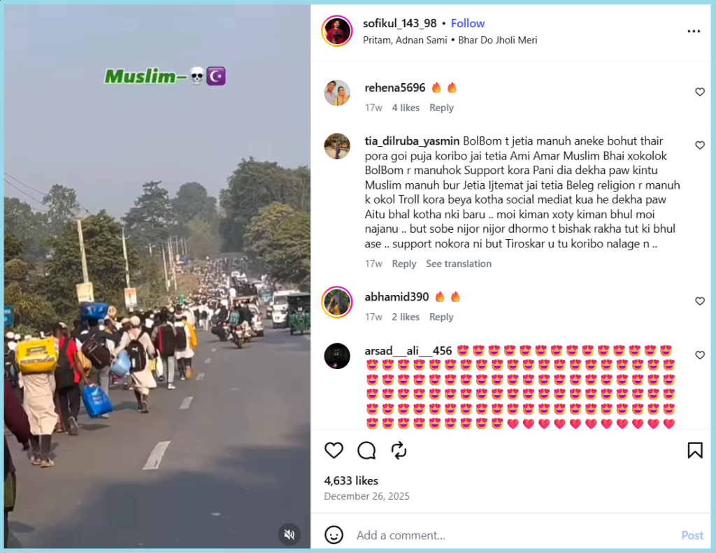 To know more, we contacted the Instagram user. The user, Sofikul, confirmed that he shot the video in December 2025 during the last day of “Ijtema”. He said, “It was the last day of Ijtema in December 2025 at Alomganj Gauripur, Dhubri Assam. Some people falsely claimed that it’s related to the West Bengal Assembly Elections”.