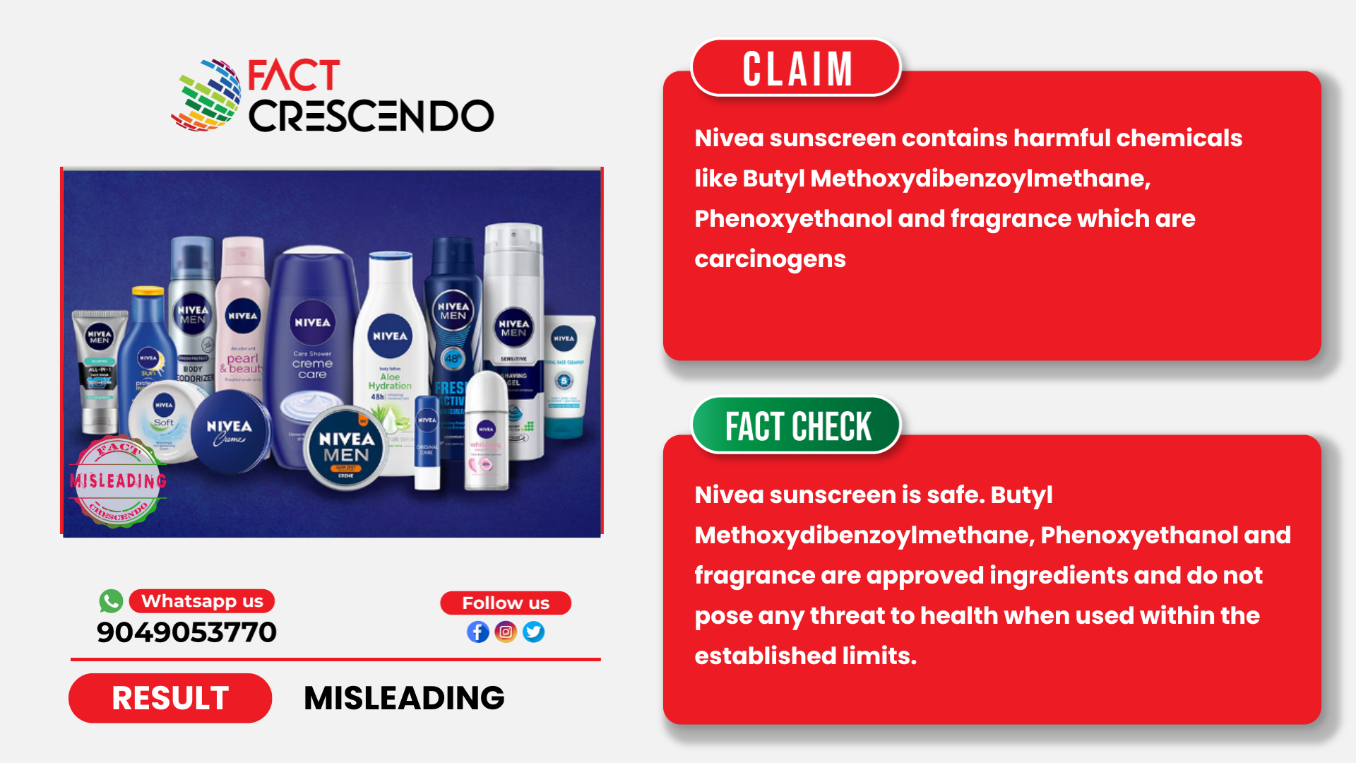 However, Fact Crescendo found the claim to be misleading. Nivea sunscreen contains all approved ingredients. Butyl Methoxydibenzoylmethane, Phenoxyethanol and fragrance are considered safe when used within established limits and concentration.