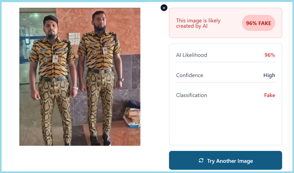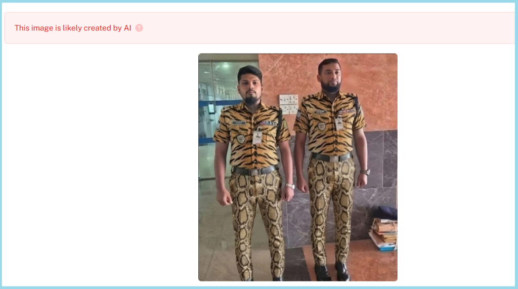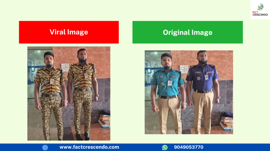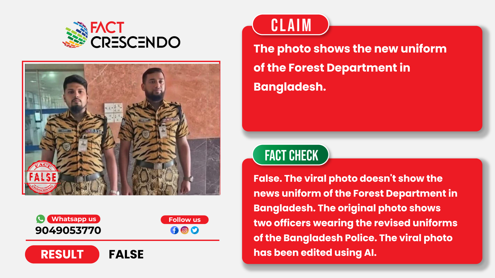 From our investigation, we can say that the claim is false. The viral photo doesn’t show the news uniform of the Forest Department in Bangladesh. The original photo shows two officers wearing the revised uniforms of the Bangladesh Police. The viral photo has been edited using AI.