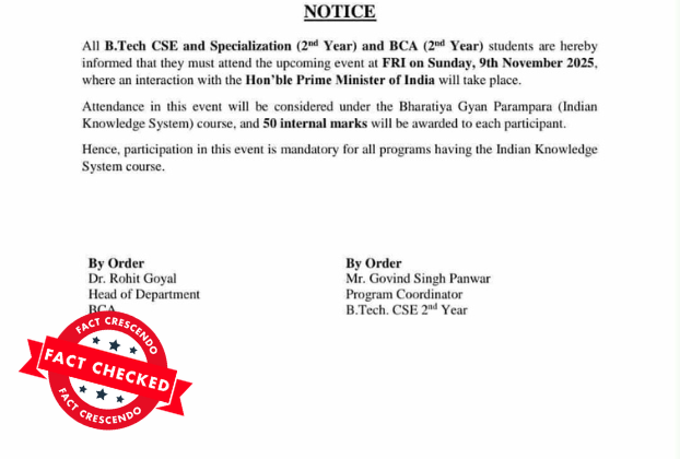 Recently a letter allegedly issued by Dev Bhoomi Uttarakhand University went viral on social media. The letter states that students’ attendance at Prime Minister Narendra Modi’s programme has been made mandatory and 50 internal marks will be given to each student for it. Facebook Link | Archived Link However, as we investigated, we came to […]